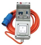 A standard unit for tent use consists of a single or triple 3-pin UK socket in an integral distribution box with a 10amp double pole MCB and 25amp RCD. This is connected to a cable with a 240V commando type site plug at the opposite end. These cables and sockets are sold complete at reputable camping outlets.